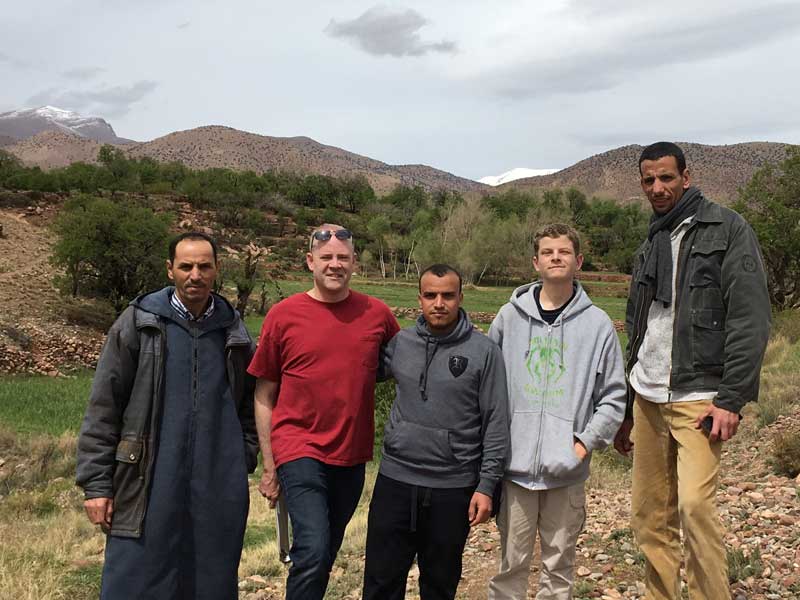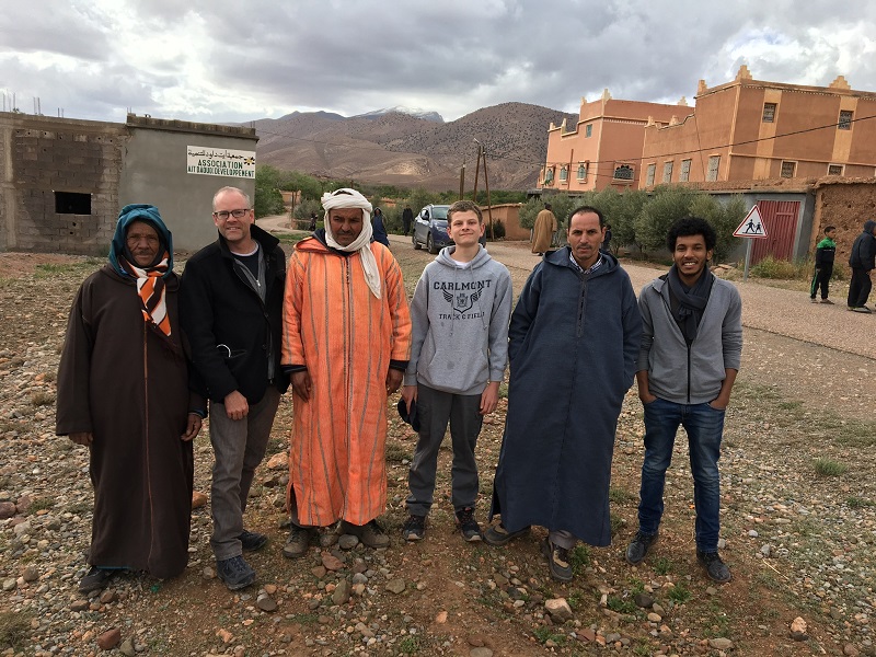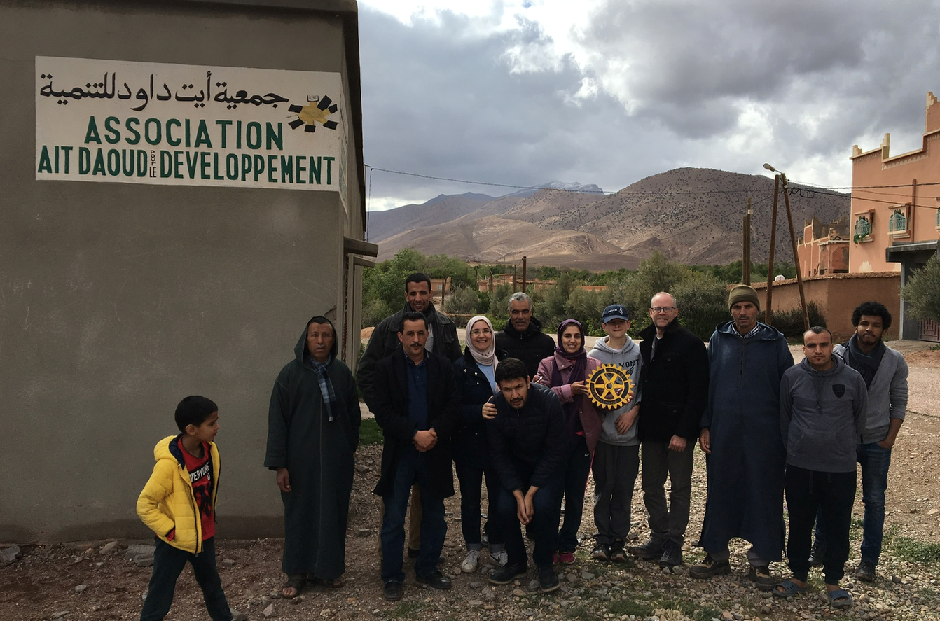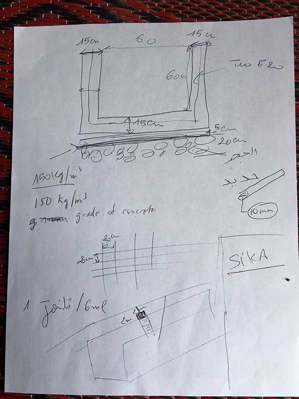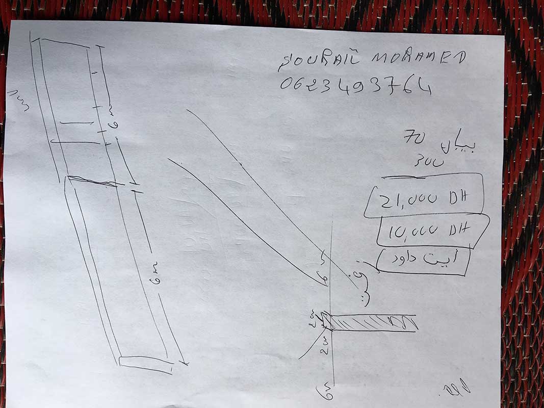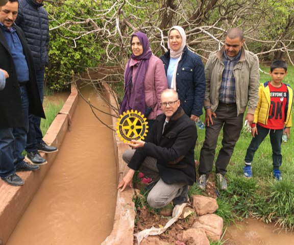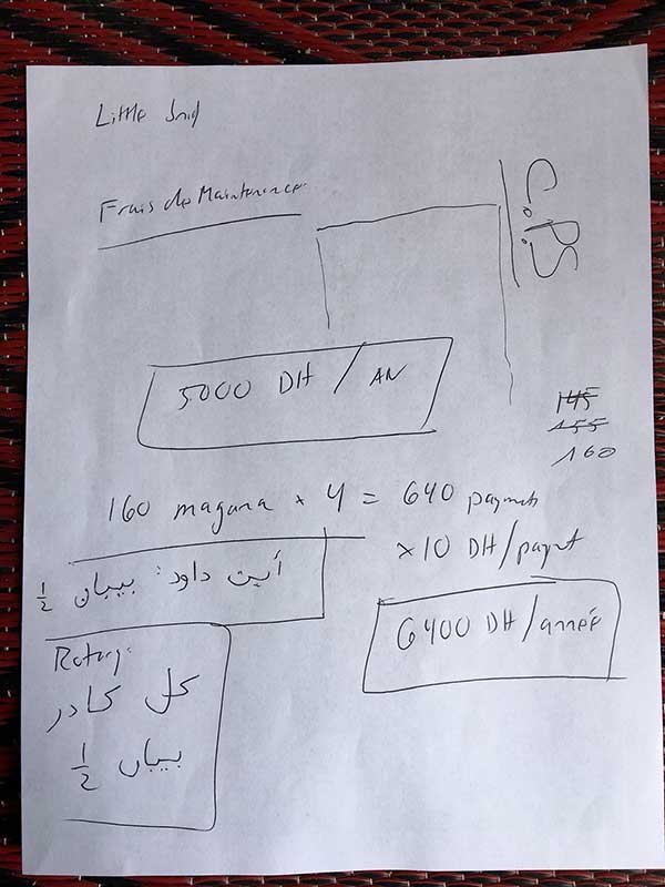 Sketching out specifications for the construction of the aqueduct, with the help of the Rotary Club of Marrakech-Majorelle and a civil engineer, Boujemaa Ami Qassi, accompanying us on the trip.