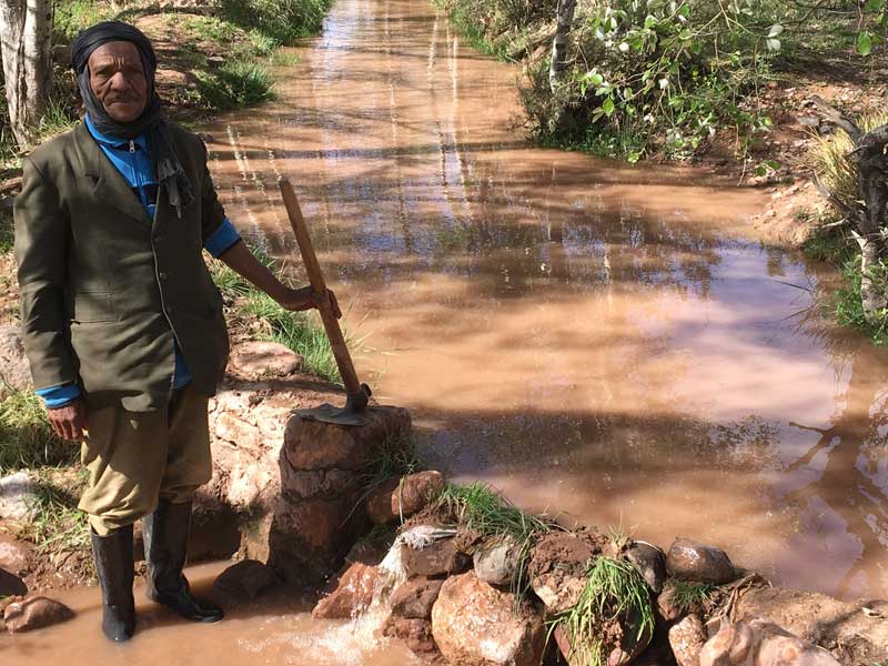 Crossing through Ait Daoud to specify the location of the doors along the aqueduct. Snow-capped mountains in the background, which are the source of the water.