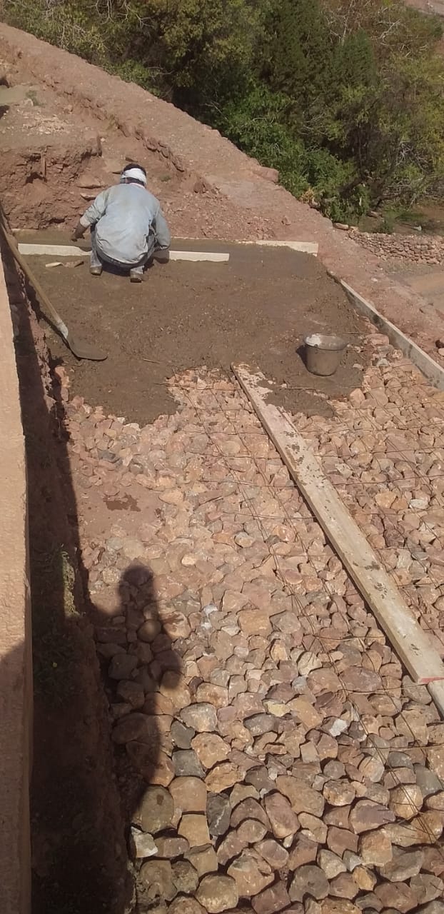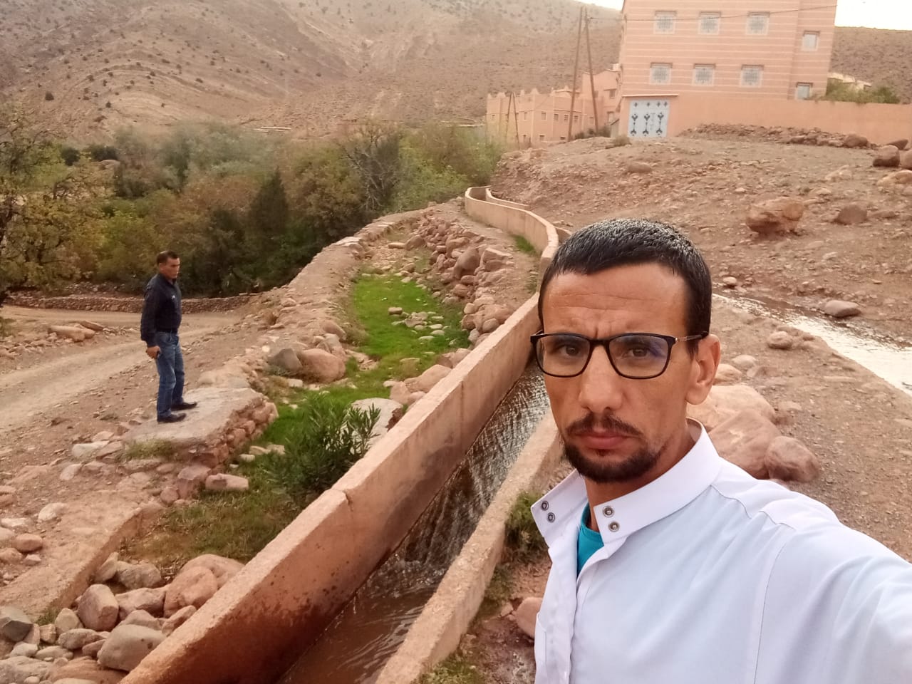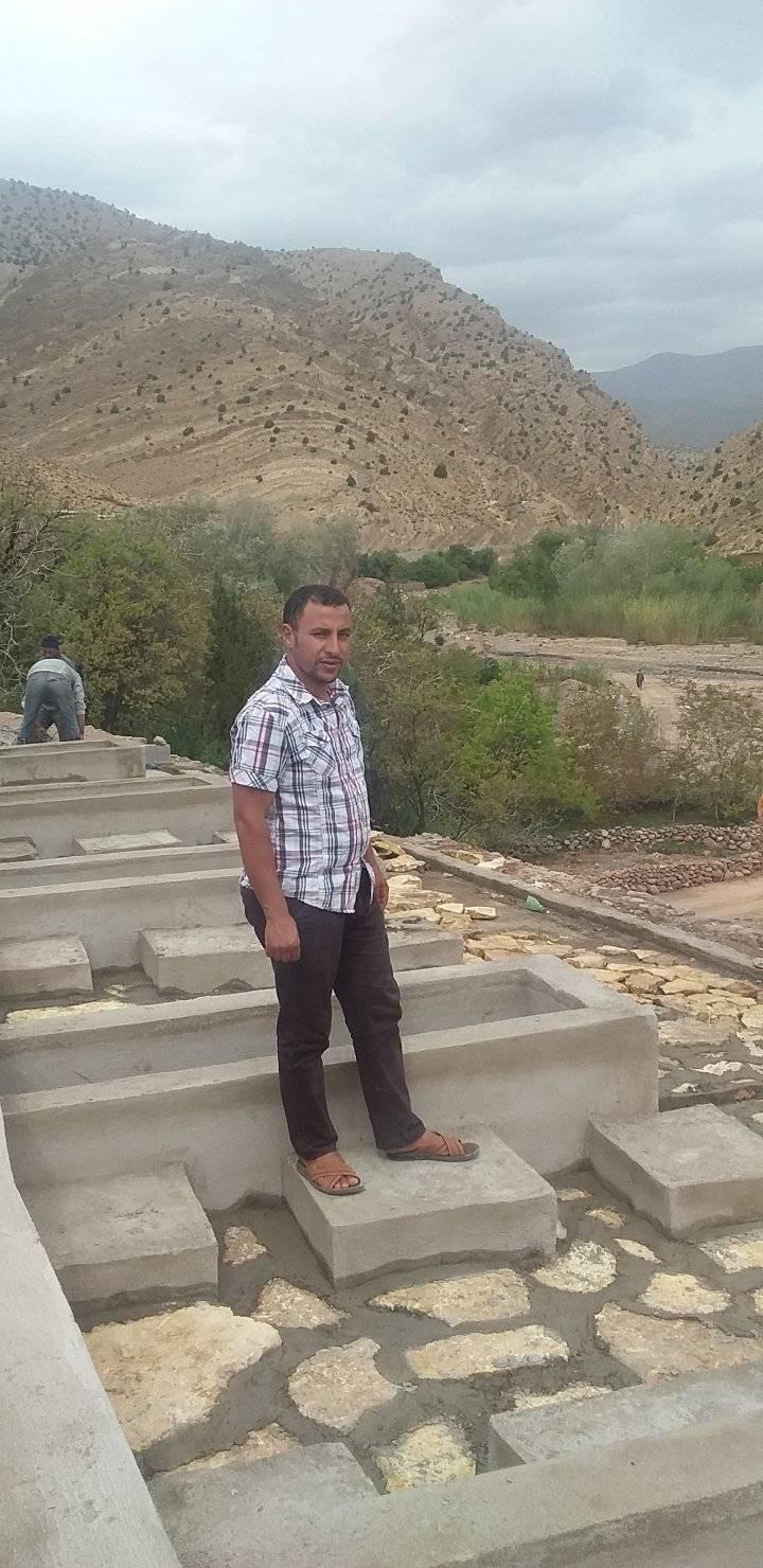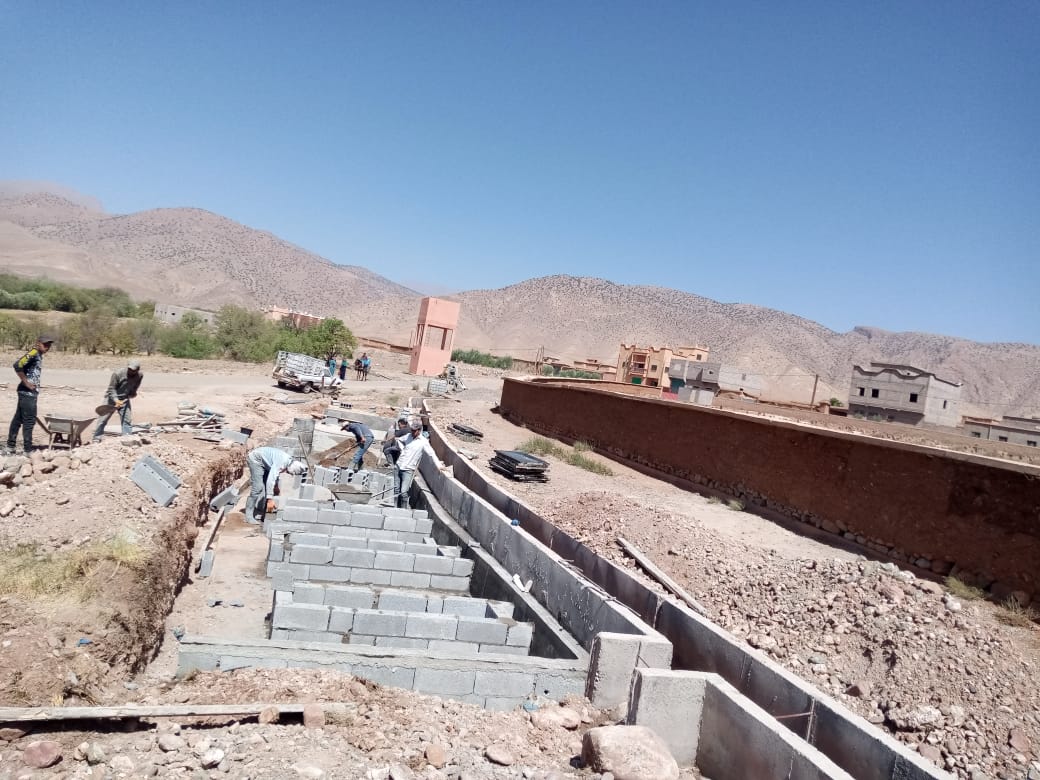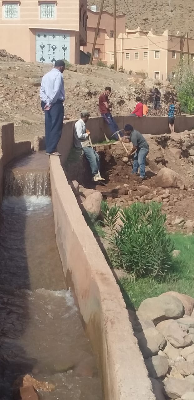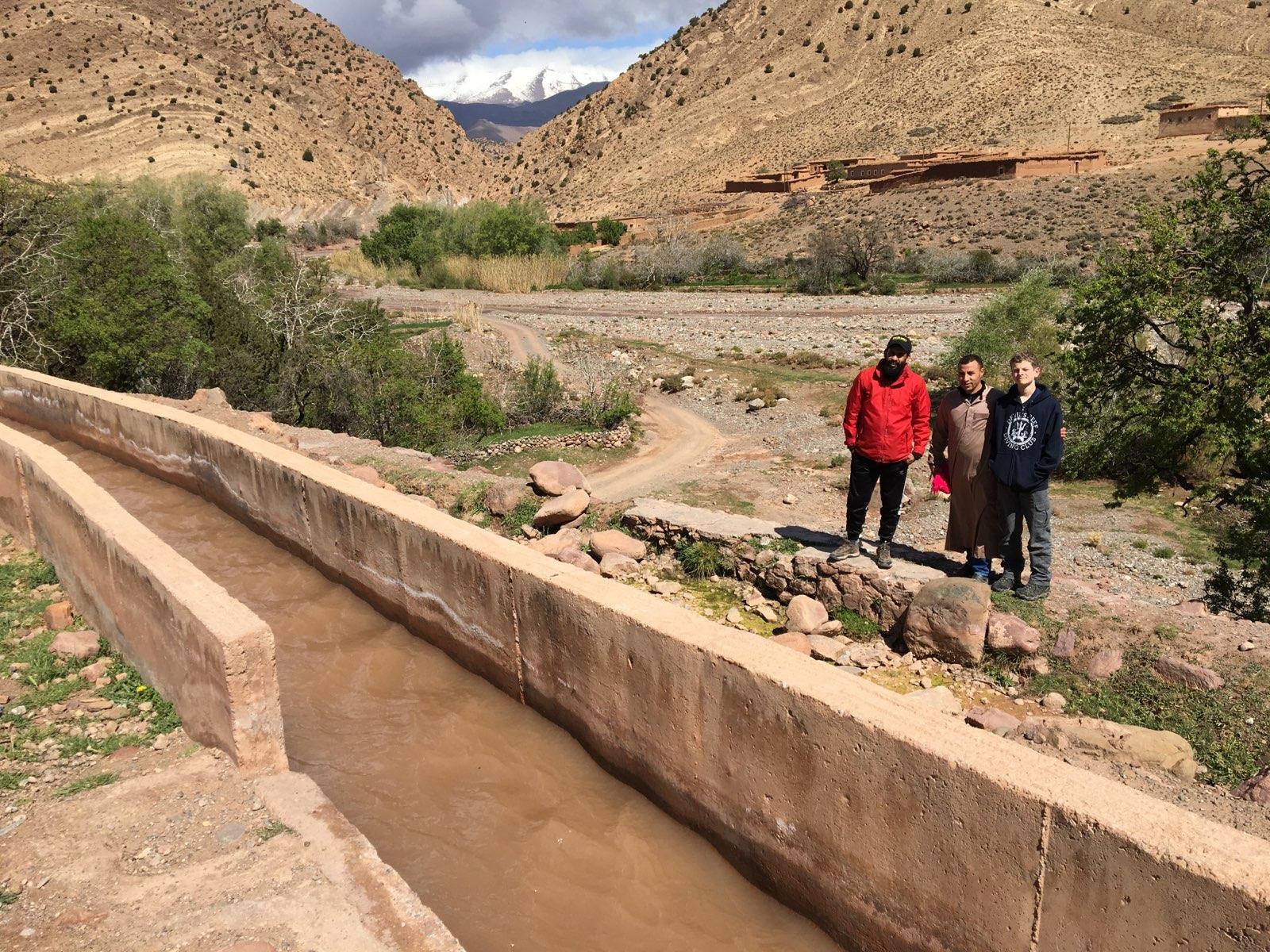 The Corps Africa volunteers stationed on-site recognized the potential to build washing stations along the aqueduct, which would reduce labor for women and help divert detergent and bleach away from the irrigation water. Here we are identifying a site for a laundry station in Ait Mousou Daoud in our 2019 site visit.